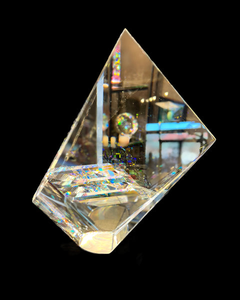 Each one of Jack Storms cold glass sculptures starts at the core. The artist then cuts, grinds, polishes and laminates the glass together, hundreds of times; until he achieves the core design he aspires for. Jack is known to reference the theory of Fibonacci throughout ideation and creation of all his glass designs. He then encases the core into optical crystal and hand sculpts each piece to shape. Each one of his glass sculptures takes anywhere from six to twenty four weeks to create and all of his artworks are original pieces of fine art. All of Jack Storms glass sculptures are designed using a cold-working lathe. There is no heat involved in the process whatsoever. The materials used on each one of Jack Storms’ glass sculptures are 32% optical lead crystal, optical crystal and dichroic glass.